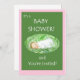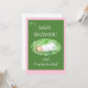 Tarjeta de invitación Baby Shower para un chica de recién nacido, con un bebé dormido y letras blancas en un fondo verde oscuro, con un borde rosado.