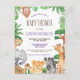 Invite a amigos y familiares a celebrar su ducha de bebé con esta dulce y encantadora postal de invitación a la ducha de bebé animal de safari en la jungla. Este diseño presenta bonitos animales bebés africanos como un elefante, cebra, jirafa, mono y un león rodeado de follaje botánico. Personalizar el texto elegante con el tipo de letra y el color de su elección o deje esta tipografía popular para su comodidad. Hay otros colores y estilos disponibles. Contáctenos y nos alegraremos de asistirle para que su fiesta sea perfecto.