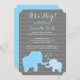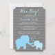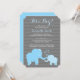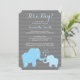 Elefante Baby Shower Invitation Blue and Grey. La mamá dulce y el elefante bebé que sopla el corazón moldea burbujas en un fondo de chevron gris oscuro. Un dulce - Es un niño - una invitación a la ducha de bebé.