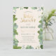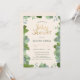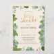Esta invitación a la ducha para bebés de personalizable contiene un borde ilustrado de flores verdes, grises y azules con un fondo de color crema (que puede cambiarse a tu gusto). El texto "Baby Shower" está en una fuente de escritura moderna y dorada. Los nombres de los futuros padres y detalles del evento pueden ser personalizados para su evento especial. El reverso es un color crema a juego (también cambiable) con un patrón dorado de quatrefoil.