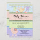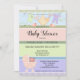 Una invitación a una ducha de bebé neutra con bonito, con un diseño de rayas pastel con figuras personalizados de ropa de bebé y un oso de peluche en una parrilla.