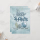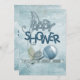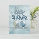 Fondo de papel azul y blanco, cinta azul, dos hojas de purpurina azul giratoria y un bebé azul. Y por supuesto la palabra "Baby Shower" en textura de purpurina azul. Puedes personalizar el texto en la parte trasera de este bonito diseño para hacer que esta sea tu invitación personalizada de la ducha de bebé!