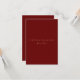 Este elegante guión dorado y una tarjeta de invitación a la ducha de novia de color rojo profundo presenta un guión moderno y un texto limpio para un diseño rojo profundo, sencillo y elegante, que le encantará. Añade texto personalizado para proporcionar cualquier información adicional necesaria para tus invitados. Siéntase libre de enviarme cualquier pregunta relacionada con el diseño - ¡estaré encantado de ayudar!