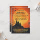La invitación a la fiesta de Halloween presenta un diseño dramático y espeluznante con una casa embrujada sobre una colina, silueta contra una gran luna amarilla brillante. La casa embrujada se sitúa en primer plano, con sus elementos oscuros y agobiados que contrasta marcadamente con la luna amarilla brillante y espeluznante. Los murciélagos se representan volando alrededor de la luna, lo que añade un ambiente espeluznante. El fondo es una mezcla de tonos amarillos y naranjas, creando un gradiente vívido y espeluznante que pasa de los amarillos profundos y acechantes de la parte superior a naranjas más cálidos y encendidos en la parte inferior. Las siluetas de la casa embrujada y los murciélagos se representan en negro intenso, haciéndolas sobresalir dramáticamente contra el colorido telón de fondo. En la parte superior del frente, la leyenda dice: "¡Te invitan a una noche de Halloween Spooktacular!" El texto es audaz y llamativo, diseñado para destacar en el naranja vibrante y el fondo amarillo. Debajo del pie de foto, hay espacio para los detalles del evento, como fecha, hora y ubicación, que se pueden personalizar según sus necesidades. Las fuentes y los colores son totalmente editables para alinearse con el aspecto deseado. La parte trasera de la invitación continúa con el mismo llamativo fondo de gradiente amarillo y naranja, incorporando sutilmente las siluetas de la casa embrujada y los murciélagos de una manera descolorida. Este lado incluye espacio adicional para texto adicional, donde puede proporcionar más detalles o instrucciones como "¡Se fomentan los disfraces!" o "¡Únete a nosotros para una noche de espantosa diversión!" En la parte inferior, hay espacio para los detalles de RSVP, incluyendo información de contacto y un plazo de respuesta. Este diseño combina de manera efectiva una estética espeluznante y dramática con información fiesta esencial, perfecta para invitar a los invitados a una memorable celebración de Halloween.
