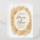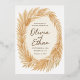 Invitación de bodas cálidas con pampas, hojas de palma secas y tonos terracota. Marco floral circular con nombres caligráficos y texto mínimo para un boda de inspiración desértica.
