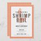 Invitación para fiesta de langostinos al vapor con una ilustración de langostinos y un patrón de cuadros. Esta invitación sería perfecta para una variedad de ocasiones, incluyendo cenas de ensayo, fiestas de graduación, celebraciones de cumpleaños y aniversarios.