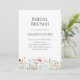 ¡Celebremos a la futura novia con esta impresionante Invitación de Brunch de Novia a la acuarela de Watercolor Wildflowers! El elegante fondo blanco está bellamente decorado con un elegante tipo de letra boho que añade un toque de capricho al diseño. El impresionante y colorido prado de flores silvestres al final de la invitación crea un hermoso contraste con la parte superior, simple pero moda. Esta invitación es perfecta para cualquier novia que ame el estilo bohemio y quiera celebrar sus próximos nupcias con un brunch novidal divertido y festivo. ¡Envía esta invitación a todas las mujeres importantes en la vida de la novia y prepárate para una celebración memorable!