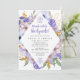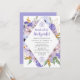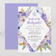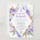 Elegantes flores moradas y azules crean un marco en forma de diamante para rodear los detalles de su brunch después de la boda.