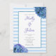 Un diseño de bonito de flores de horangea azul con rayas azules y blancas. Las invitaciones y las tarjetas están disponibles en una selección de opciones de forma (bordes redondeados, vieiras, etc.) y en una selección de texturas de papel. Los estilos de fuente, el color y el tamaño son personalizables. Encontrará otros diseños con muchos productos de coordinación en nuestra tienda, incluyendo invitaciones, guardar la fecha y las tarjetas rsvp, etiquetas de agradecimiento y más.