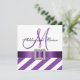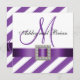 Invitaciones a bodas en monograma púrpura y blanco con un patrón de rayas diagonales y una cinta de satén púrpura IMPRESIONADA y un broche de diamante cuadrado en un diseño de tarjeta plana cuadrada. Diseño de diseño por Elke Clarke ©2012. Gráficos con licencia. Personalizar con su monograma, nombres y texto boda usando las indicaciones de "personalizar" para más opciones de edición. A las novias les encantan las invitaciones adornadas con joyas y cintas hasta que llegan a la oficina de correos y se dan cuenta que las invitaciones costarán mucho más para enviarlas a sus invitados. Estas invitaciones y accesorios de paquetes boda tienen la foto de la cinta satinada y el broche diamantado IMPRESO en la tarjeta plana. Usted termina con el elegante efecto sin el costo extra y el trabajo de ensamblar sus invitaciones. Póngase en contacto con luxuryweddinginvitations@gmail.com para obtener otros colores o ayuda con su diseño o cualquier otro elemento que necesite.
