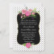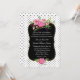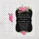Elegante y romántica invitación a una boda hecha con un fondo blanco, con pequeños puntos negros de polka. En medio de la invitación, un espacio de texto negro decorativo con un borde dorado tiene una hermosa acuarela de flores de peonía rosada. Personalice el texto en blanco para su día especial. Hay productos que coinciden.