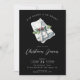 La invitación a cenar a nuestros Navidades incluye un elegante marco para cenas de vacaciones y un ambiente alegre y verde con el dicho "come, bebe y sé alegre". La invitación es sencilla y elegante, con un fondo negro y texto blanco.
