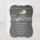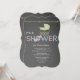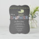Una encantadora invitación basada en un fondo de pizarra con un pequeño coche de bebé, una delicada vid y la palabra "ducha" en rosa y azul.