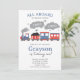 Cualquier invitación de cumpleaños del tren de edad. Personalice la información editable para su celebración. Perfecto para un tema de tren. Presenta un lindo tren rojo y azul dibujado a mano, todo el texto es editable.