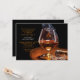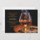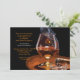 Una invitación para un hombre para celebrar un cumpleaños, aprobar el examen de la barra, despedida de soltero y más. La tarjeta presenta humo que sale de un cigarro encendido junto a un vaso de brandy o coñac.
