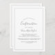 Esta minimalista invitación de confirmación de plata es perfecta para un simple evento religioso. El moderno diseño romántico presenta una tipografía clásica de color gris plateado y blanco, acompañada de una caligrafía rústica y elegante con un estilo de letra a mano vintage. Personalizable de cualquier color. Mantenga el diseño simple y elegante, tal como está, o lo personaliza añadiendo sus propios gráficos y obras de arte.