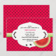 Una alegre invitación de verano que incluye una rodaja de sandía sobre un fondo rojo con semillas de sandía. El fondo está cubierto de una floración blanca decorativa adornada con semillas y una cinta de corteza de melón. Las dos pequeñas hormigas pueden ser arrastradas a cualquier lugar o eliminadas. Un diseño divertido para cualquier fiesta o reunión de verano.La tarjeta es fácil de personalizar con su redacción, fuente, color de fuente y elección de seis tipos de papel.