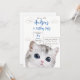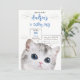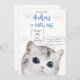 Invitación de cumpleaños con tema de gato para nuestra próxima celebración. Invitación a la fiesta de cumpleaños del niño con un tema de gatos adorables, con un gatito blanco con los ojos azules sobre un fondo blanco. Bichos de presupuesto aceptables para personalizar los detalles de su fiesta.