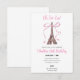 Estas adorables invitaciones de cumpleaños a las acuarelas incluyen un retrato de acuarela de la Torre Eiffel con un arco de cinta rosada atado alrededor de la parte superior.