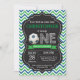 Invitación al cumpleaños 1 Fiesta. Invitación a fiesta de cumpleaños. Bash de cumpleaños temática del deporte de fútbol. Fondo Chalkboard Chevron azul, verde y blanco. Primer cumpleaños. Digital Imprimible.