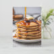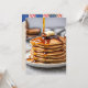 Gran pila de panqueques con sirope goteando y una porción de mantequilla para una invitación a desayuno de panqueques del 4 de julio.