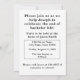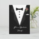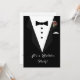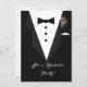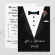 El diseño presenta el aspecto de un esmoquin en la parte delantera, y el texto de la invitación en la parte trasera. Las letras están en una fuente negra clara sobre un fondo blanco. Recuerda, las bodas no son solo para la novia.