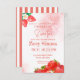 ¡La vida está a punto de ser mucho más dulce con esta invitación a la ducha inspirada en fresa! Los racimos de fresas rodean una fuente moderna clásica sobre un fondo de color rojo. Estos divertidos tipos de letra escritos a mano complementan la jovialidad de los racimos y las flores de fresa.