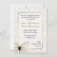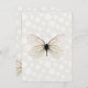 Bonita ducha de matrimonio en tonos blancos y dorados, con un toque blanco sobre damasco floral como fondo. Los gráficos de un área de texto con bordes dorados y tonos dorados tienen texto negro y marrón dorado listo para personalizar para su evento boda. Dibujo gráfico de una hermosa mariposa blanca, decora la esquina inferior izquierda y en la parte trasera de la invitación.