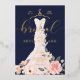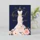 Anuncie su evento de ducha de novias con nuestra elegante, elegante y moderna rosa de flores en la ducha de novia para la futura novia. El diseño presenta moda pintada a mano, elegante y moderno vestido de boda blanco y rosa pálido con un jardín botánico de rosas y flores florecientes. El vestido floral está colgado en una colgante adornada con un traje dorado de estilo vintage. Los detalles de los encajes florales suaves y los estampados brillantes en el vestido boda crean un ambiente hermoso, sofisticado y lujoso. Una hermosa tipografía de escritura a mano estilo guión "Bridal" en Relieve metalizado de oro real. La paleta azul marino, rosa rubor y dorado crea un estilo moderno, chic y vintage. El reverso presenta un fondo minimalista de color rosa pálido con un patrón cardíaco que complementa con gusto las obras de arte frontales. Todos los ilustraciones contenidos en esta elegante invitación a la ducha de novia con trajes de boda floral son obras de arte originales de Moodthology. Puede personalizar el tamaño del texto, el color del texto, la fuente y el diseño para su preferencia personal de diseño.