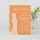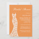 Un hermoso vestido de encaje vintage representa esta invitación a la ducha de novia con un fondo naranja.