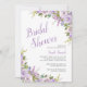 Personalizado económico imprimió invitaciones a la ducha de novias. Este diseño femenino de bonito tiene un borde floral acuático con flores moradas pastel y vegetación. Personalice el diseño con los detalles del fiesta de ducha de novia. El lado inverso tiene un patrón de banda de color morado o usa el espacio para agregar texto y fotos adicionales. Haga clic en Personalizar para elegir cualquier color de fondo y editar los tipos de letra y colores del texto para crear uno único de los tipos de invitación a la ducha de boda en primavera o verano.