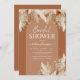 Invitaciones rústicas bohemias a la ducha de novias con fondo de terracota con un rasgo de arco, hojas de palma secas del desierto acuáticas, pasto pampas y una elegante plantilla de fiesta nupcial que es fácil de personalizar.