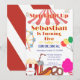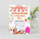 ¡Acérquense! Invite a sus invitados al espectáculo más grande de la tierra con esta invitación moderna y caprichosa con tema de carnaval. El diseño presenta un techo de carpa colorido y una noria alegre, rodeada de todos sus snacks favoritos de la feria como palomitas de maíz, un hot dog y una bebida de carnaval. Esta invitación personalizable es perfecta para la fiesta de cumpleaños de un niño y prepara el escenario para un día lleno de juegos, golosinas y diversión.