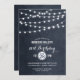 Moda diseño de invitación de fiesta de verano moderno con elegantes y sencillas lámparas de cuerda que cuelgan por encima y una elegante mezcla de fuentes de escritura modernas y caligráficas sobre un fondo de textura falso color de agua. Un diseño sencillo y elegante, perfecto para el verano. Haga clic en el botón IT PERSONALIZAR para personalizar de fuentes, mueva el texto y cree su propio diseño único de invitación.