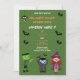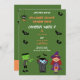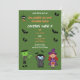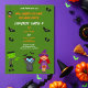 Invitación a la fiesta de cumpleaños de Cute Costume Halloween con divertidos personajes de Halloween Frankenstein, Dracula y una linda bruja con murciélagos y amigos araña tipografía festiva de Halloween que usted puede personalizar fácilmente. ¡Feliz Halloween!