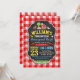 Invitación a la celebración del cumpleaños de una granja con mantas rojas, tractores rojos, un granero y bonitos animales de granja, un caballo, un cerdo, una vaca, pollo y pato. Esta invitación es perfecta para una fiesta de cumpleaños temática para niños o chicas de granja.