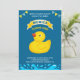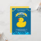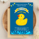 Invite a sus huéspedes con esta encantadora invitación para una fiesta de cumpleaños que incluye un adorable pato de caucho con elementos vibrantes sobre un fondo azul. Simplemente agregue los detalles de su evento en esta plantilla fácil de usar para convertirla en una invitación única. Girar la tarjeta para mostrar un patrón de rayas amarillas y blancas en la parte posterior de la tarjeta.