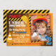 Lugar de construcción con fondo de tierra, gorra duro, cono y cinta de construcción. Diseño de la tarjeta de invitación de fiesta de cumpleaños. Edad 2.