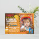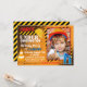 Lugar de construcción con fondo de tierra, gorra duro, cono y cinta de construcción. Diseño de la tarjeta de invitación de fiesta de cumpleaños. Edad 11.
