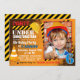 Lugar de excavación con fondo de tierra, gorra duro, cono y cinta de construcción. Diseño de la tarjeta de invitación de fiesta de cumpleaños. Edad 6.