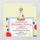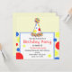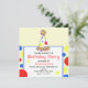 Invitación a una fiesta de cumpleaños con el ilustracion de un gorra de cumpleaños con puntos de polka rojos, amarillos y azules en la parte superior. Características de fondo que coinciden con los puntos de polka. Personalice el texto.