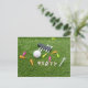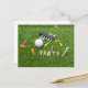 Tarjeta postal de anuncio de invitación a fiesta de golf con pelota de golf y tee verde