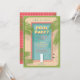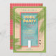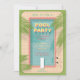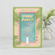 Pool Party Invitation con una piscina ilustrada de estilo moderno de mediados de siglo. Los diseños incluyen elementos de azul, rosa, frondas de hojas de palma, piscina y diseño retro.