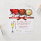 Hermosa invitación para fiestas, con una fotografía de pelotas adornadas de oro y rojo Navidad y brillantes estrellas en un fondo blanco, en la parte superior de las invitaciones, con un borde de una cinta y un arco de satén rojo. Una copa de vino, en la parte inferior, tiene una caña de caramelo colgada de la copa para darle un toque de fantasía. Personalizar el texto para adaptarlo a sus necesidades.