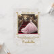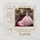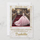 La imagen representa a una quinceañera posando para la foto, bajando la escalera de un lujoso salón adornado con motivos dorados y candelabros. Esta es una celebración tradicional hispana para la joven que cumple 15 años y será presentada a la sociedad como una señorita.