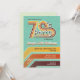 Invitación a fiesta de los 70 con una tipografía de estilo retro de 'Fiesta de los 70'. Los diseños incluyen elementos inspirados en los setenta como azul, naranja, amarillo mostaza, rojo oscuro y marrón, rayas y textura vintage. Incluye una plantilla para personalizar.
