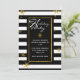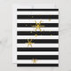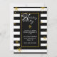 Elegante y moderna invitación de vacaciones hecha con un patrón de rayas horizontales en blanco y negro. Los gráficos de copos de nieve con aspecto dorado decoran el fondo, y un área de texto negro con borde dorado tiene texto blanco que lee Happy Holidays, en un estilo de tipografía. Personaliza el texto blanco de tu fiesta de vacaciones. Hay productos que coinciden.