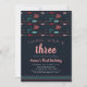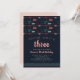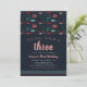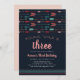 Las invitaciones para su tercer cumpleaños salvaje incluyen un borde de coloridas flechas de plumas en la marina, verde azulada y melocotón. "Joven, salvaje y tres" aparece en letras de melocotón, con los detalles de tu fiesta de cumpleaños debajo.
