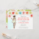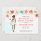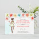 Invitación de escapada de fin de semana a la playa para despedida de soltera con un tema tropical con flores de hibisco y la futura novia disfrutando de un cóctel. Disponible con chica de pelo rubio, castaño o pelirroja y con piel oscura o clara. La parte trasera de la invitación muestra el cóctel y los detalles.
