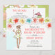 Invitación de escapada de fin de semana en la playa para soltera presenta un tema tropical con flores de hibisco y futura novia rubia disfrutando de un cóctel. Disponible con chica de pelo rubio, marrón o rojo y con piel oscura o clara. La parte trasera de la invitación presenta un cóctel y detalles.